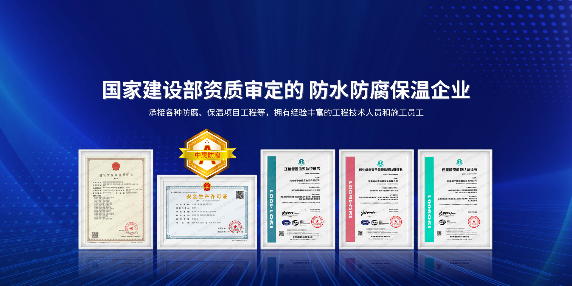 公司經營范圍:防水防腐保溫工程;消防設施工程;建筑裝修裝飾工程;建筑機電安裝工程;電力工程;建筑工程;石油化工工程;工業清洗工程;油罐清洗工程;鋼結構工程;環保工程;模板腳手架工程;電纜防火封堵、防污閃噴涂、外墻外保溫工程;各類施工勞務作業;設備維修、船舶鉚焊、涂裝;電力工程材料、建材、防水材料、防火材料、防腐保溫材料銷售,并相繼通過了GB/T19001-2008idtISO9001:2008GB/T50430-2007質量管理體系認證證書。GB/T24001-2004idtISO14001:2004環境管理體系認證證書。GB/T28001-2011idtOHSAS18001:2007職業健康安全管理體系認證證書。公司是中國防腐蝕于防護協會、中國施工企業管理協會、電力協會和中國鋼結構防水協會會員單位。 公司的經營業務涵蓋了石油、化工、電力、冶金、煤炭、船舶、國防、燃氣、水利、環保、交通運輸、航空及國防軍工和輕紡市政等行業的防腐保溫絕熱設備。鋼結構安裝、防火、防水、金屬噴鍍、聚脲噴繪、陰極保護、防滲透堵漏、玻璃鋼及各種磚版材料襯里、橡膠襯里、煙氣硫和耐酸溶劑腐蝕等工程施工。公司連續十年榮獲“省市先進施工企業”“安全生產先進單位”“重合同,守信用企業”和“AA***資質企業”的稱號。2000年被命名為市級文明單位,2002年被國家工商行政管理局命名為“重合同,守信用的企業”、被中國工業防腐蝕技術協會命名為“防腐蝕企業,能源節約及環境保護領域有豐富的經驗和***的業績。工程一次交驗合格率100%。其中攀枝花鋼鐵公司煉鐵廠四號高爐及熱風爐防腐工程、上海寶鋼公司煤氣柜防腐工程、撫順石油一廠裝置防腐項目、齊魯石化公司稀烴廠高塔防腐工程、吉林化學工業公司煉油廠油罐防腐工程、天津石化熱電廠六號爐頂棚聯絡管保溫工程、大慶油田(太倉)力神泵業工程、中國化學工程第十一建設工程、中原油田勘探局工程、中國石化銷售有限公司華北分部、魯皖輸油管道工程、貴州開磷息烽合成氨工程、陜西黃陵煤化工程、中國石油天然氣西部管道塔里木輸油工程、邯鋼集團邯寶鋼鐵公司煉鐵工程、德州供電工程、吉寶(南通)船廠工程,偃師華潤熱力工程、鄭州熱力總公司。 河南省中惠防腐安裝有限公司愿以豐富的施工經驗,***的技術,***的設備,***的管理,***的服務,竭誠為國內外廣大的用戶提供***滿意、******的工程作品。 我公司愿與國內外同仁一道,團結協作,共同推進防腐蝕行業發展! 公司地址:河南省長垣縣建設路北段360號 固定電話:0373-8866488 郵編:453400 網址:http://www_zhff_com_cn.376gs.com